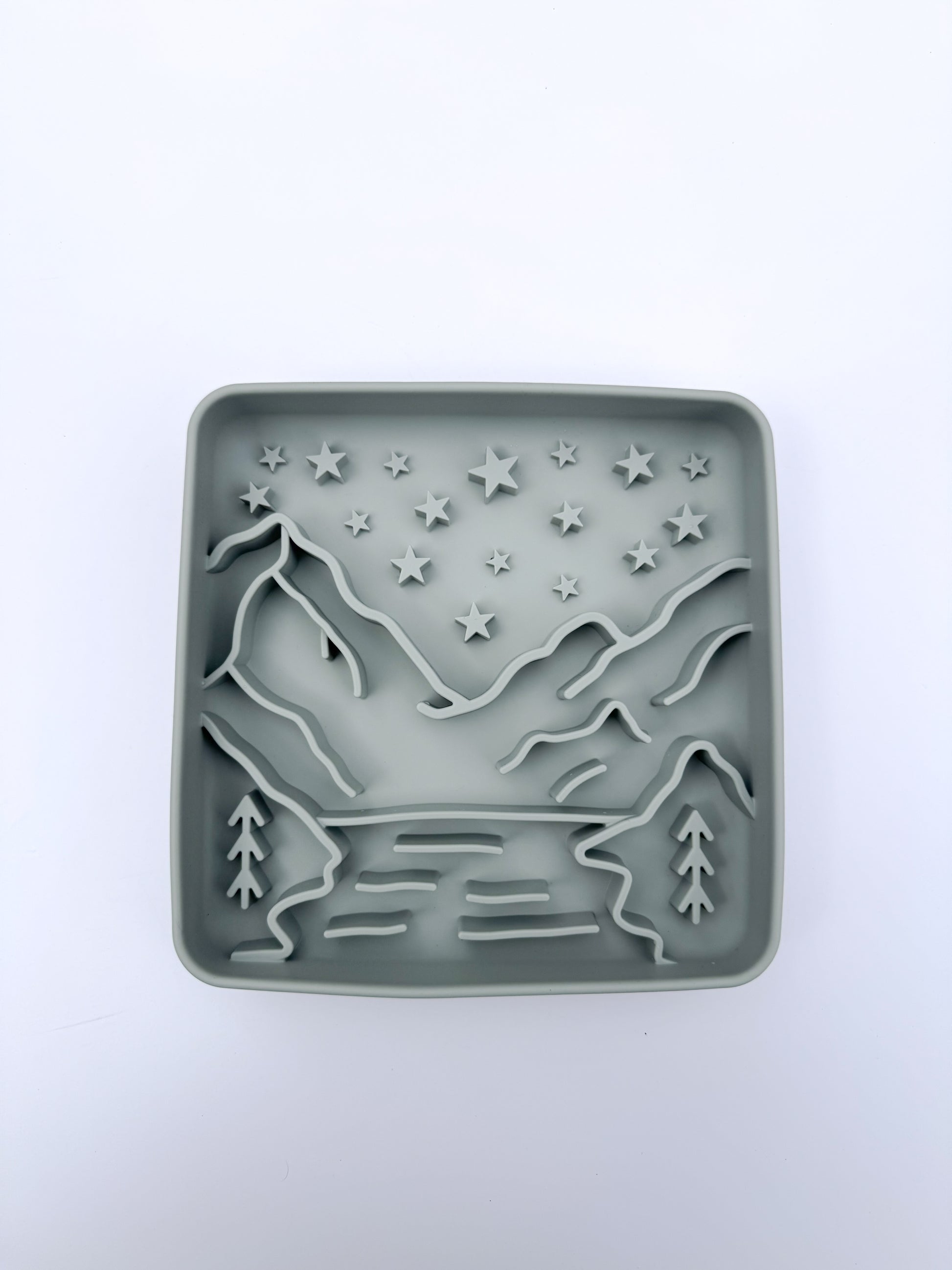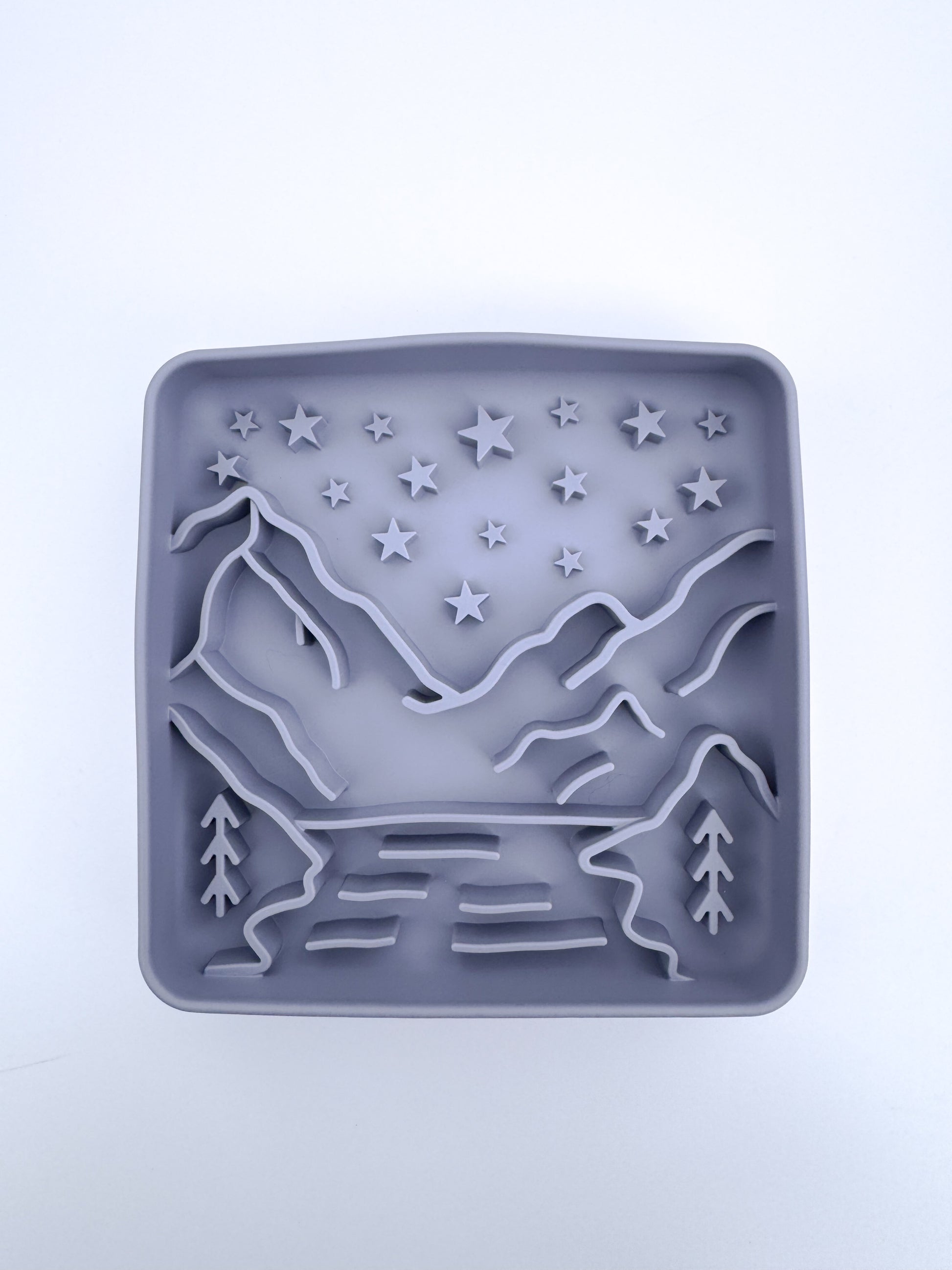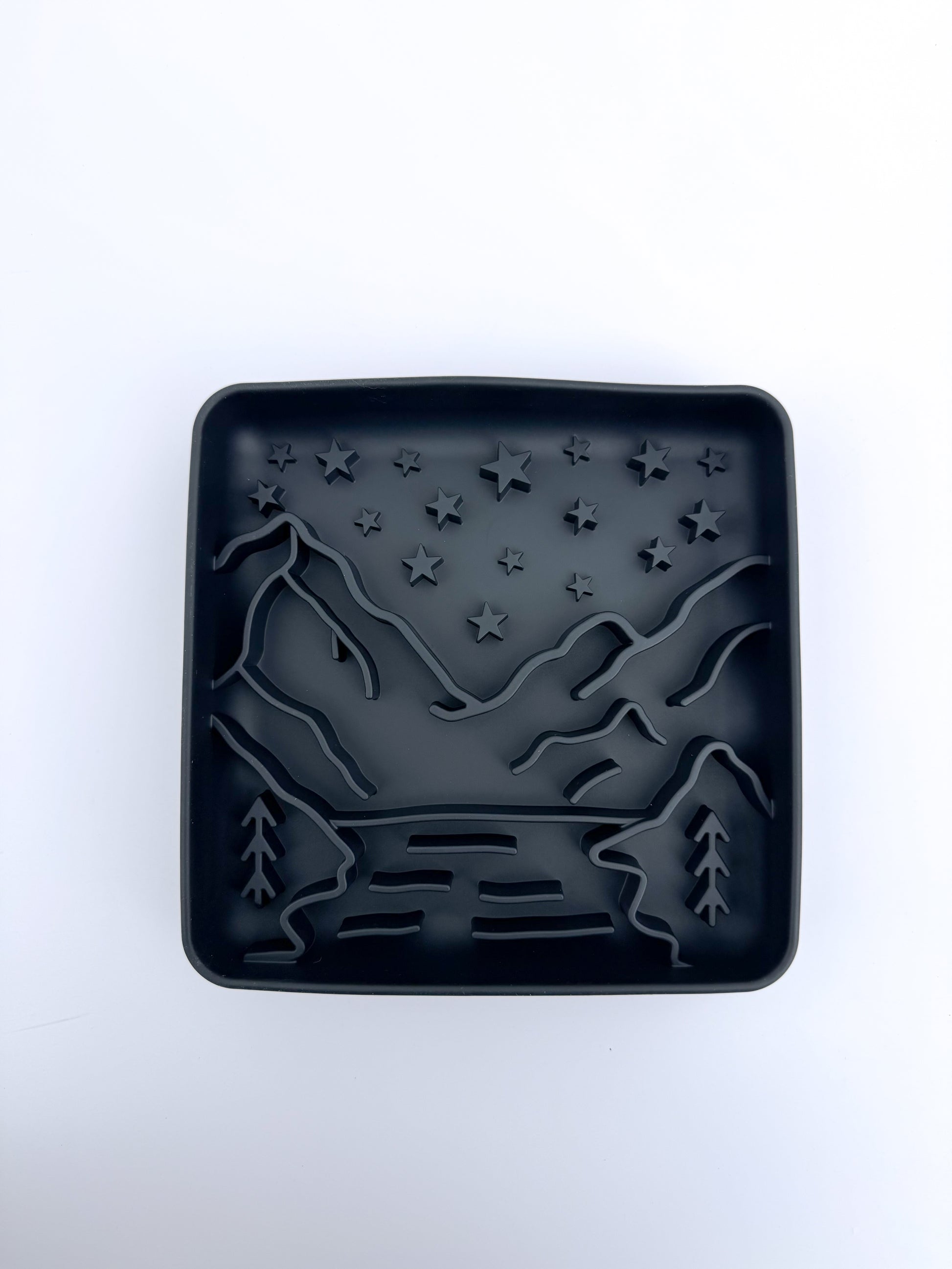 The Wanderlust Slow Feeder is a BAC exclusive item you won’t find anywhere else. Whether you’re an enrichment pro or don’t know what enrichment is, this slow feeder is perfect for your pups next meal. The design features your perfect scene from your favorite mountain escape with pine trees, a river, the mountains ahead, with the stars in the sky.